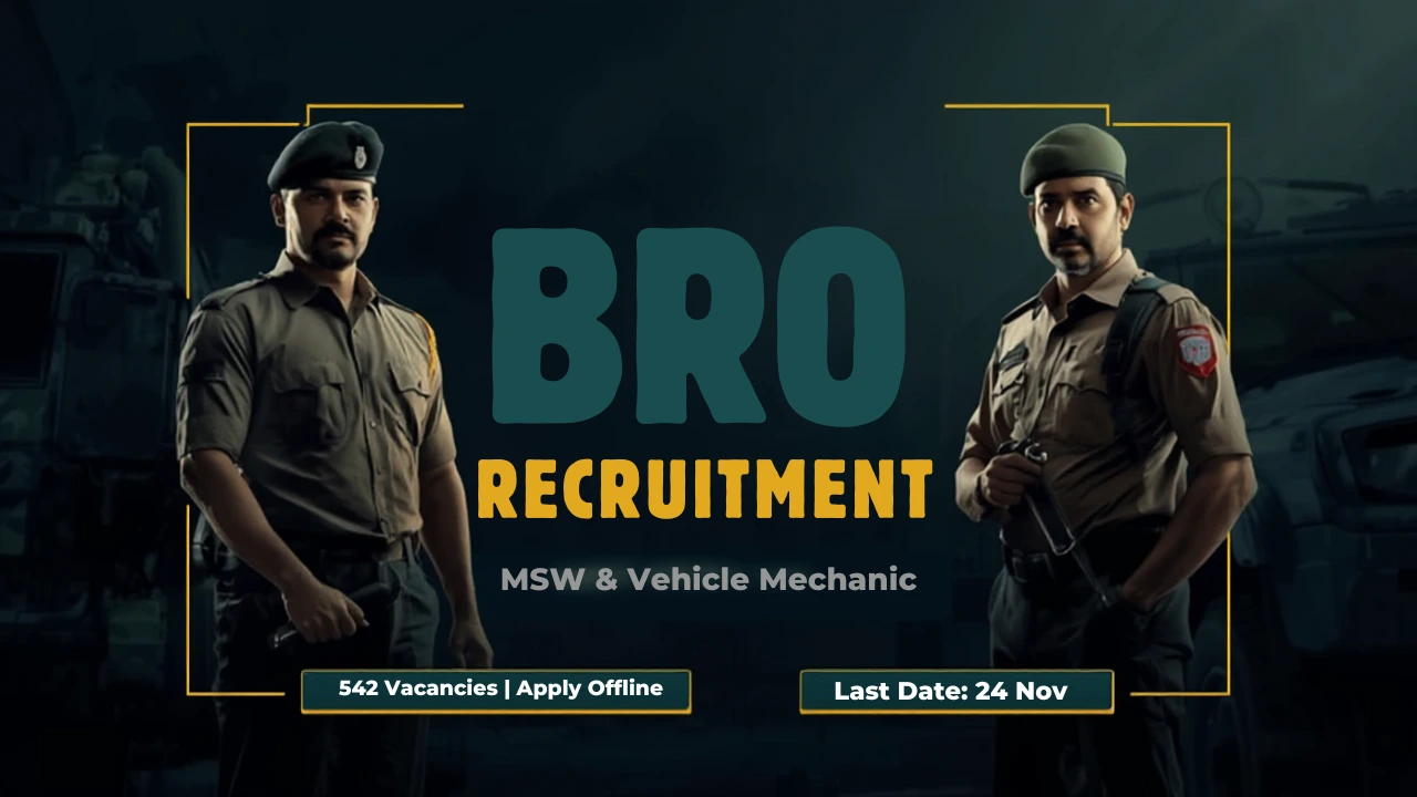 BRO MSW & Vehicle Mechanic ನೇಮಕಾತಿ 2025 ಮೂಲಕ Ministry of Defence — Border Roads Organisation (GREF) ಒಟ್ಟು 542 ಹುದ್ದೆಗಳ (Vehicle Mechanic, MSW Painter, MSW DES) ಭರ್ತಿ ಮಾಡಲು ಆಫ್‌ಲೈನ್ ಆಧಾರದ ಮೇಲೆ ಅರ್ಜಿಗಳನ್ನು ಆಹ್ವಾನಿಸಿದೆ. ಆಸಕ್ತ ಅಭ್ಯರ್ಥಿಗಳು ಅಧಿಕೃತ Notification ಮತ್ತು Application Form ಅನ್ನು ಗಮನವಿಟ್ಟು ಓದಿ ಮತ್ತು 24/11/2025 ರೊಳಗಾಗಿ ಸಲ್ಲಿಸಬೇಕು.